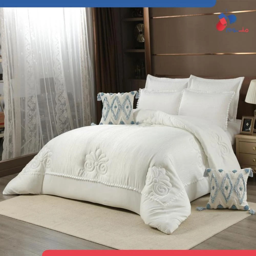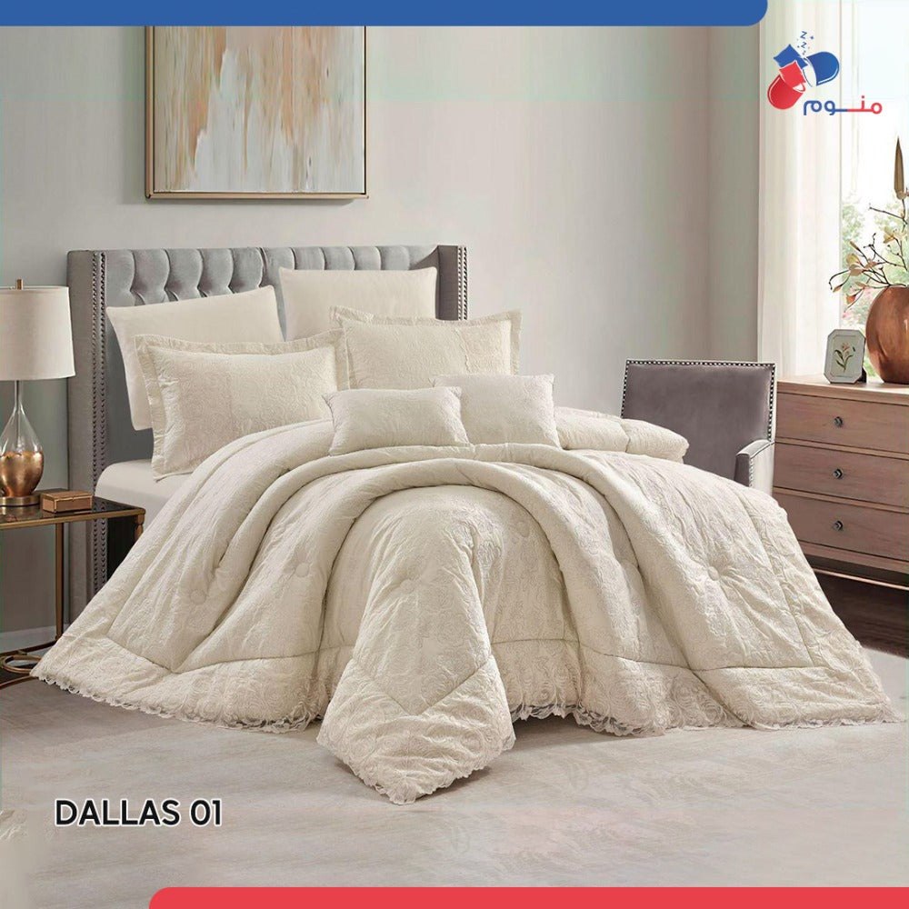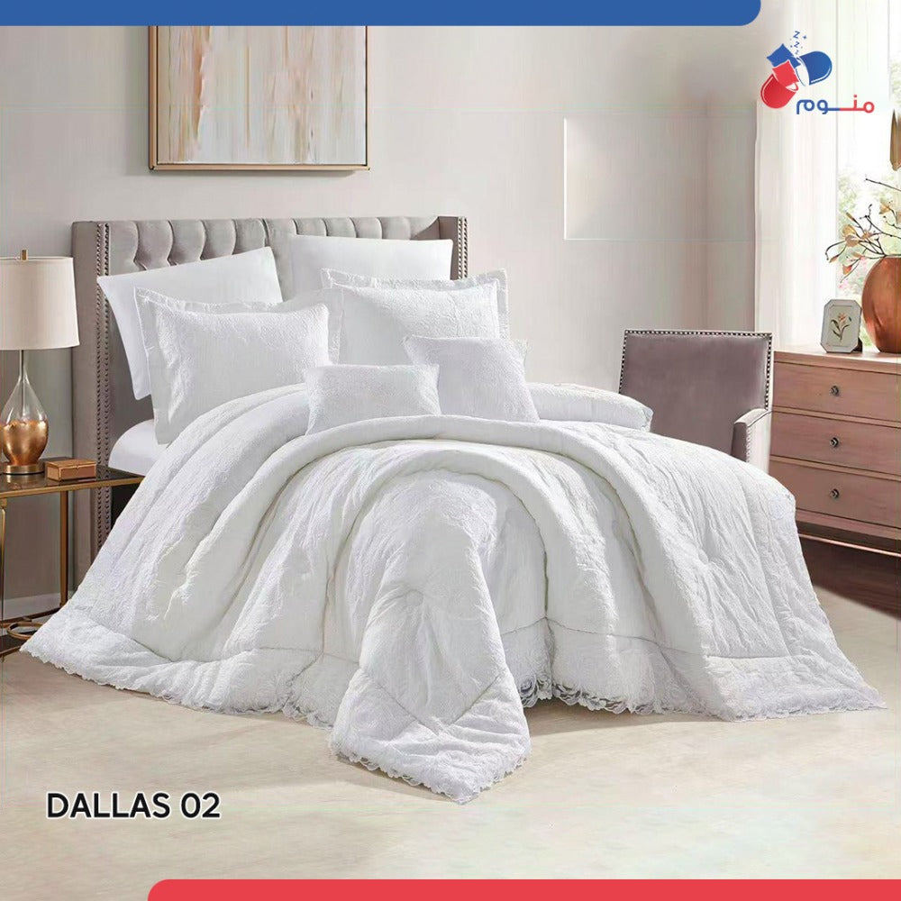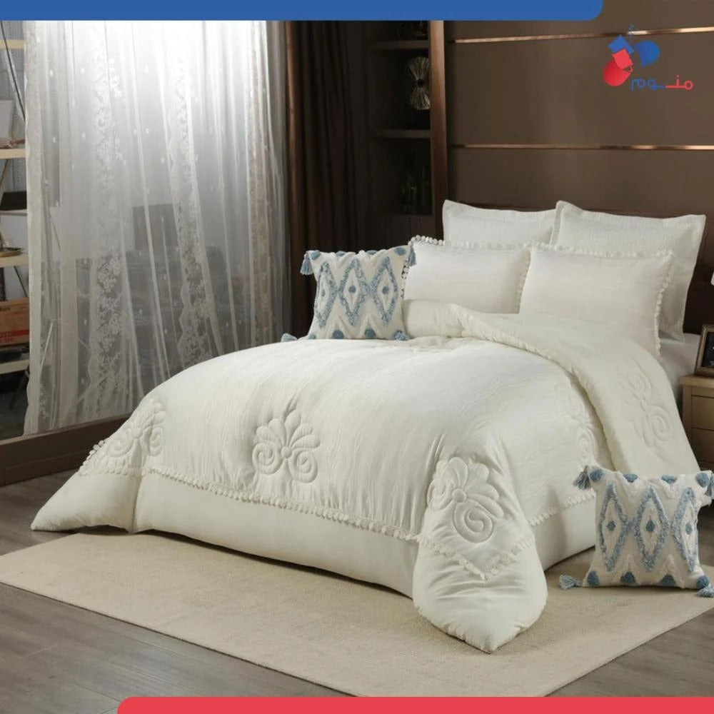 مفرش فاخر بتصميم أنيق وخامة ناعمة تمنحك نومًا هانئًا. مثالي لإضافة لمسة راقية إلى غرفتك يتكون الطقم من 8 قطع متكاملة لتمنح سريرك مظهراً متناسقاً وفاخراً